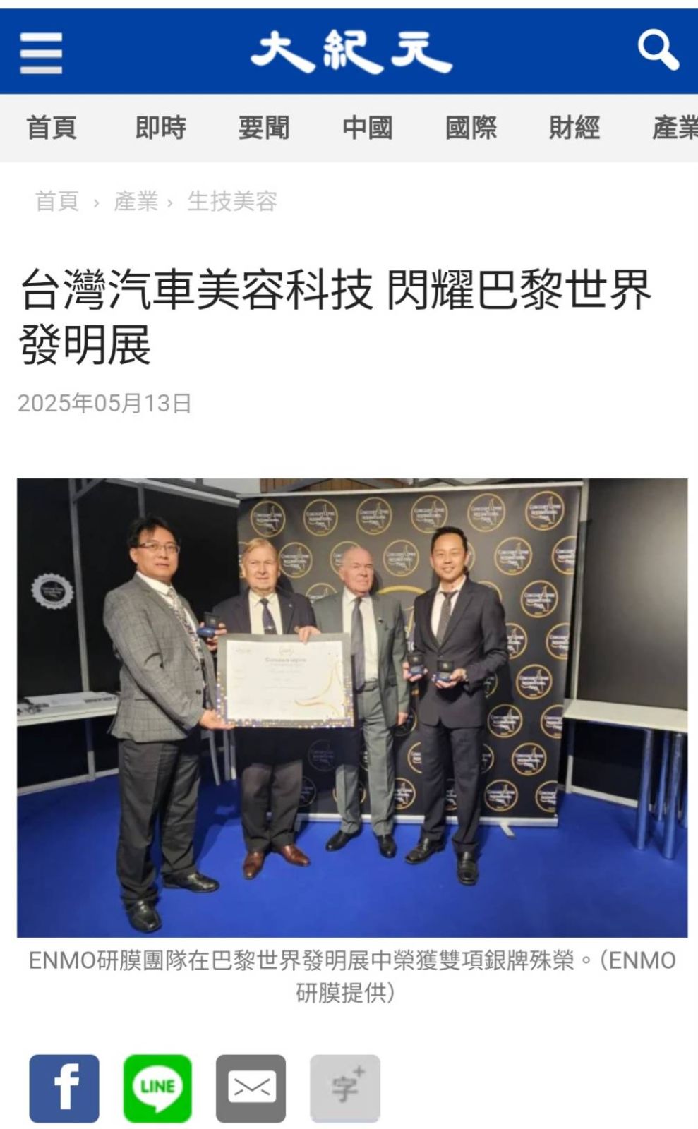 巴黎世界發明展(Concours Lépine International Paris)擁有超過120年歷史,是全球歷史最悠久且最具影響力的發明競賽之一,吸引來自世界各地頂尖創新團隊競逐殊榮。ENMO研膜此次能從眾多國際競爭者中脫穎而出,不僅再次證明台灣民間創新實力,更展現我國在精密化工、表面處理與車體應用領域的科技深度。